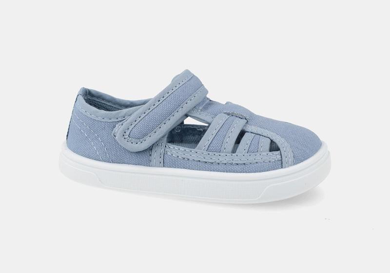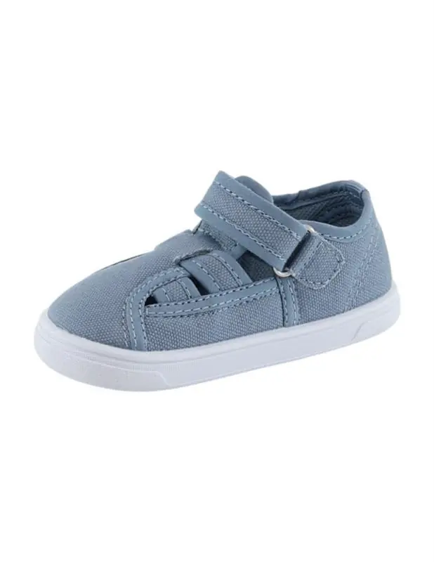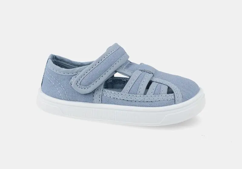 Su bonito acabado en azul claro con suela blanca combina con todo, y el cierre de velcro hace que ponerla y quitarla sea rápido y sencillo.