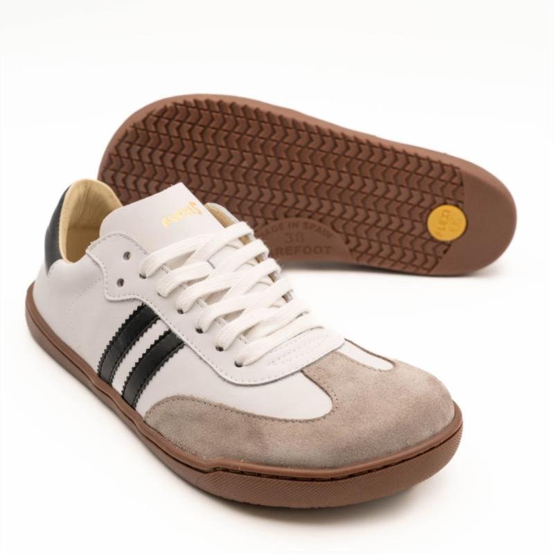 Su combinación en blanco, negro y gris aporta un estilo moderno y fácil de combinar, mientras que su diseño barefoot, con puntera ancha, drop cero y suela fina y flexible, permite que el pie se mueva con libertad y sin restricciones.